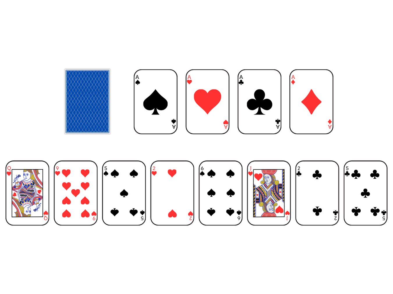 Remove the four aces from the deck to form the four foundation piles. Deal a row of eight face-up cards to form the first row of eight tableau cells. Place the remaining deck face down to form the stock.